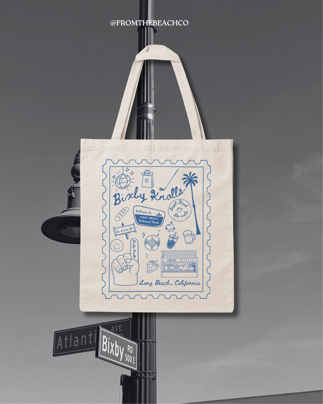 The Bixby Knolls Neighborhood Tote was designed as a small tribute to one of Long Beach’s most iconic neighborhoods. From the palm-lined streets to the beloved local landmarks, every element in the design draws inspiration from places that make Bixby Knolls feel like home.